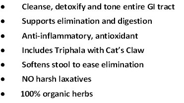 Digestion and elimination problems are the #1 reason for most doctors visits. Herbal Colon Health with Cat's Claw is a unique blend of 100% organic herbs traditionally used to support elimination and digestion and for optimal health. It helps cleanse and tone the entire Gastointestinal tract . Triphala and Cat's Claw make up this unique formulation.